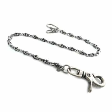 Die Amigaz-Profil-Schädelkette weist etwas dünnere, längliche Schädelköpfe auf und besteht aus Zinn mit einer dunklen Zinn-Waschpolitur. Außergewöhnliche Details, Gewicht und Styling und Made in the USA.